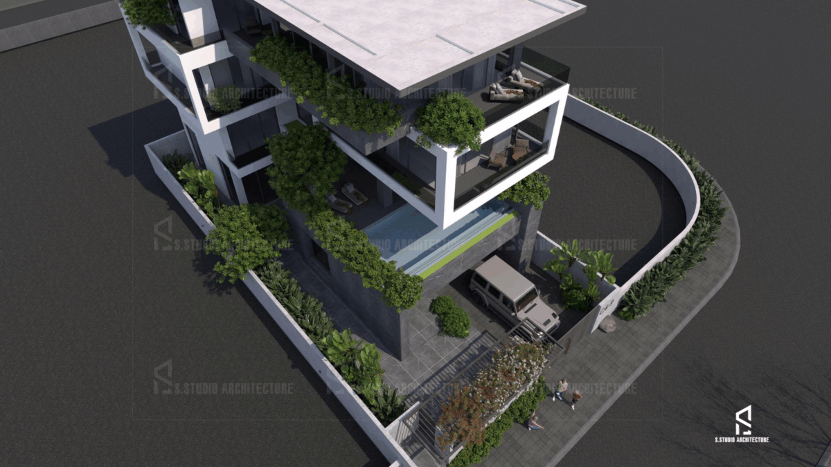 - Tầng 2 & 3: Phòng ngủ, không gian sinh hoạt chung của gia đình, hồ bơi – đảm bảo sự riêng tư.